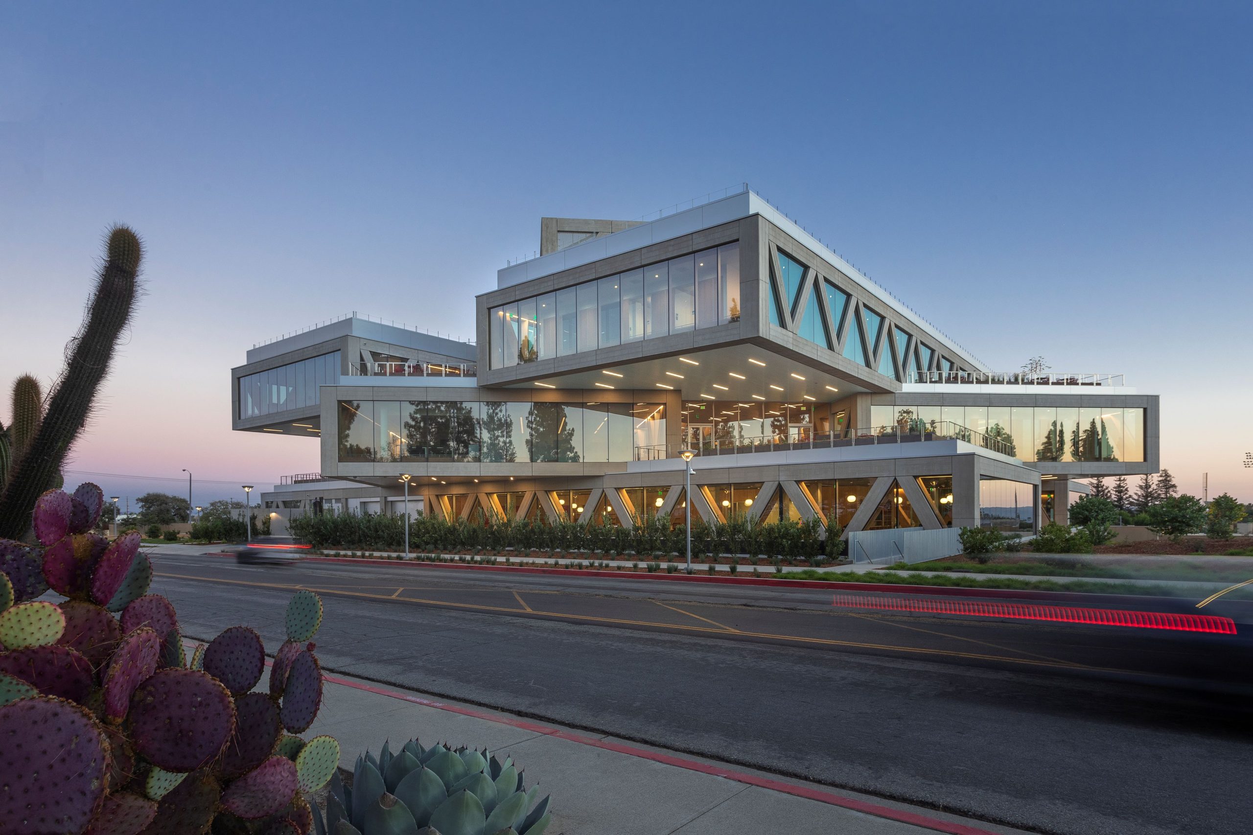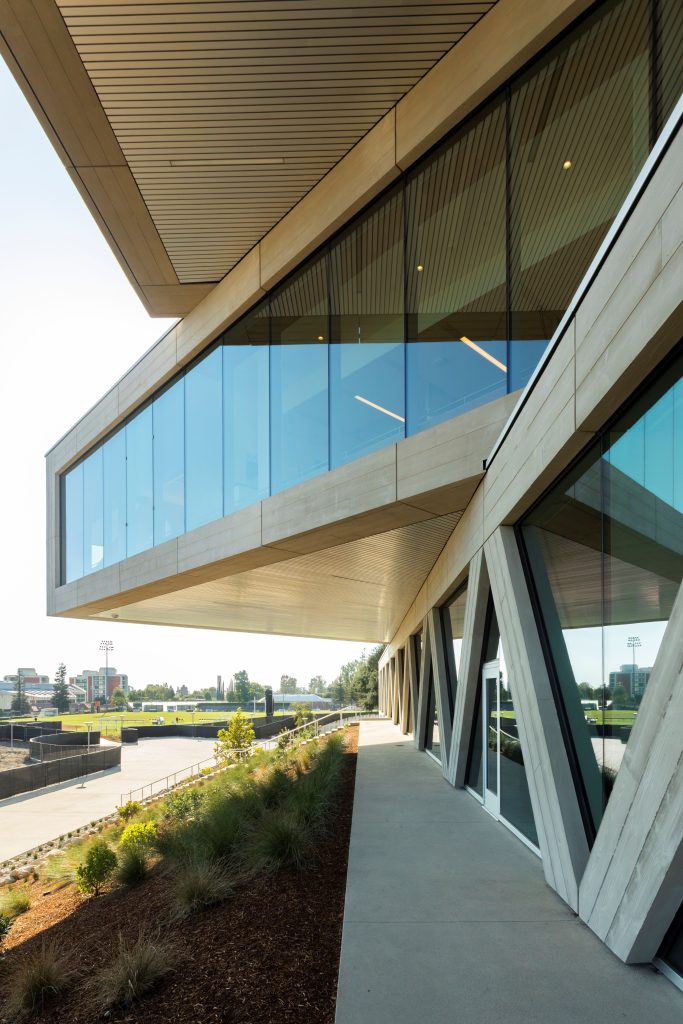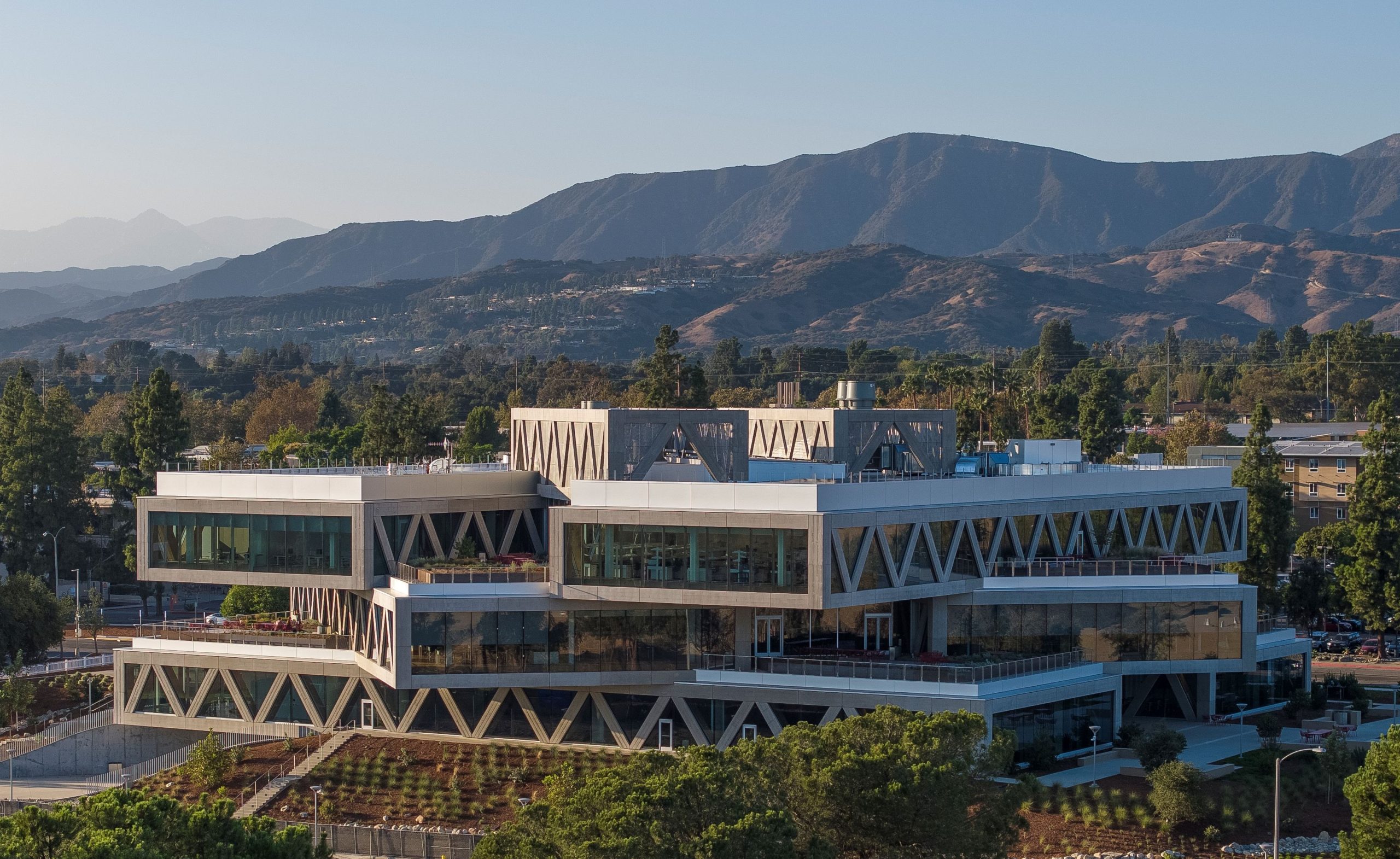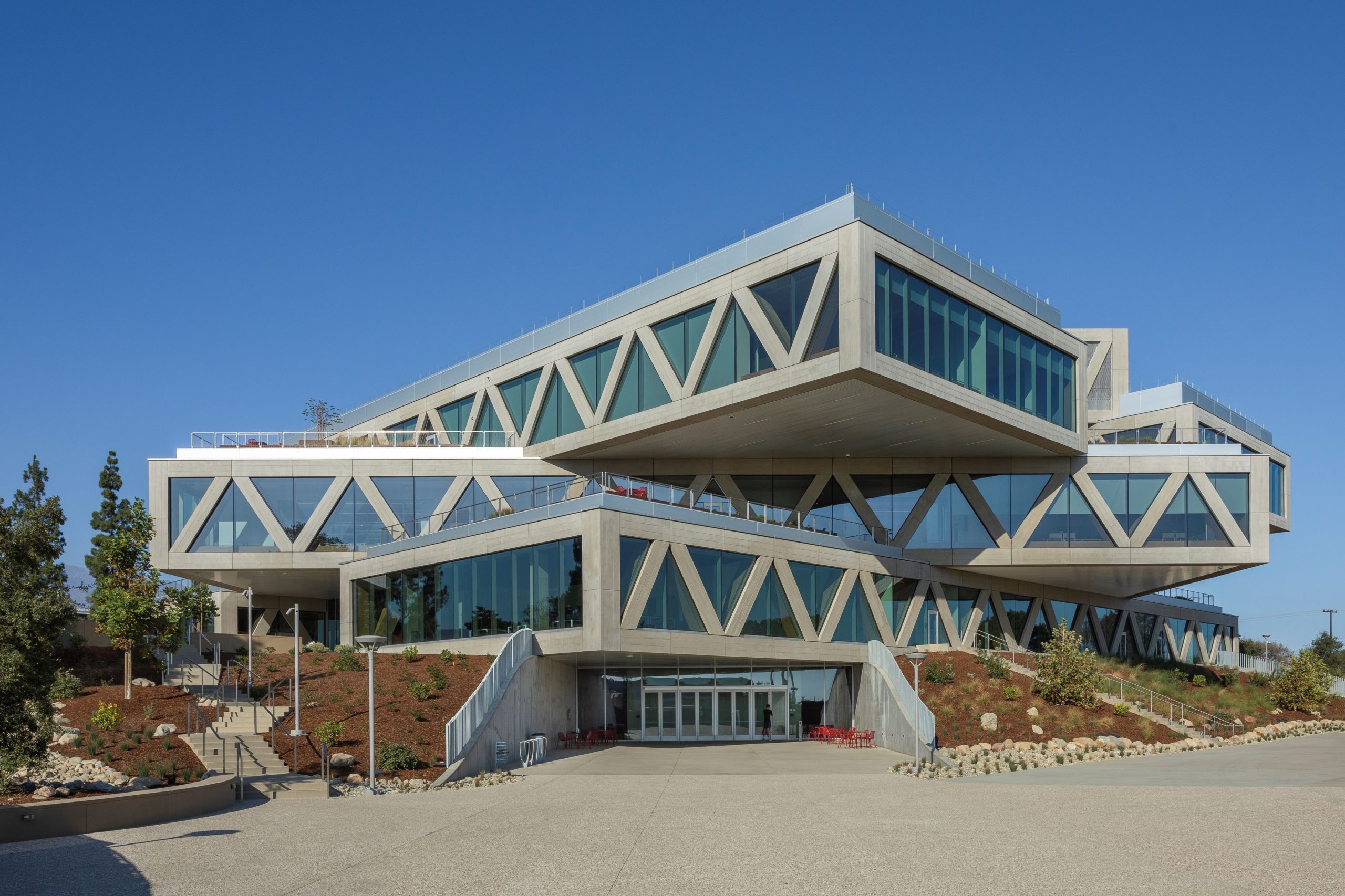 Each of the building’s three stacked floors is rotated 25 degrees, creating both outdoor and indoor terraces for student interaction. As each floor faces a different direction, the floor-to-ceiling facade ensures that building occupants enjoy wide-ranging views of the surrounding campus and mountain range.