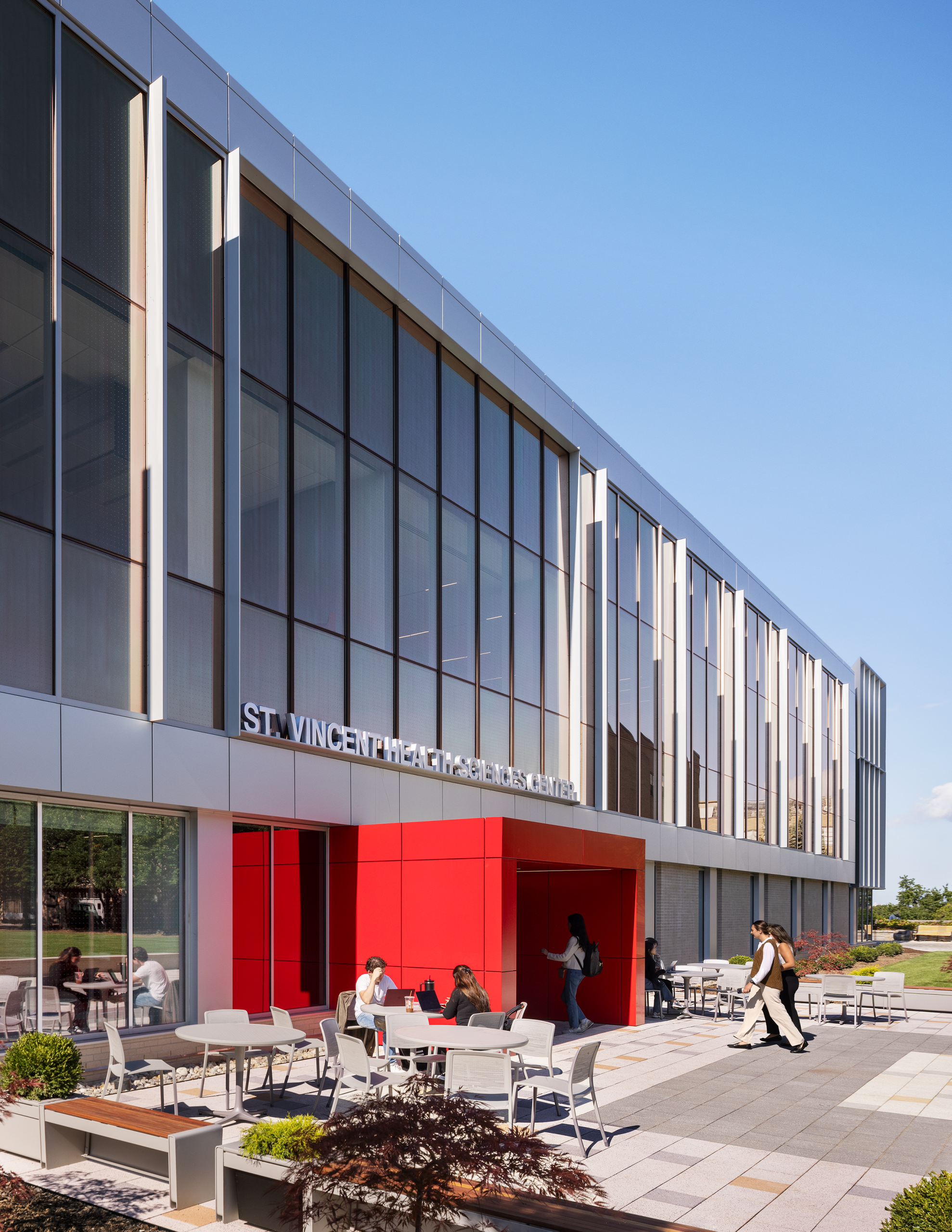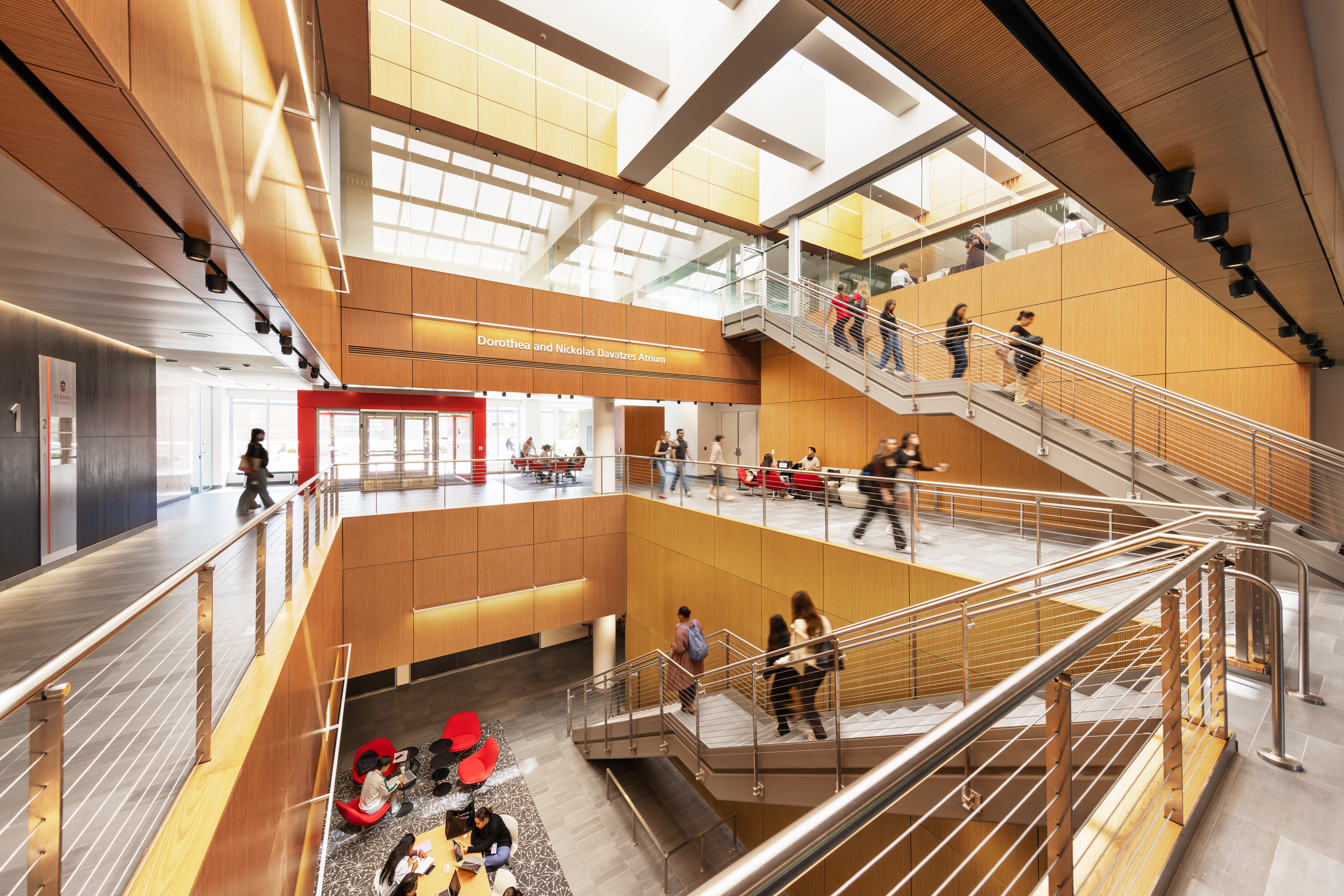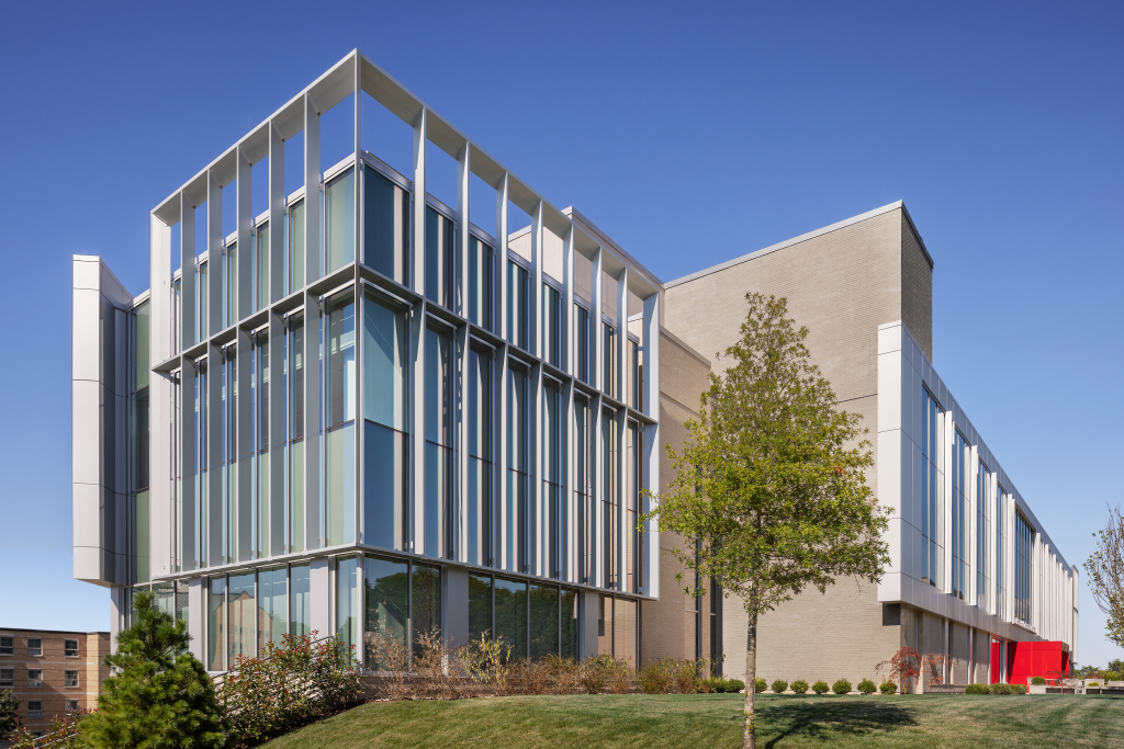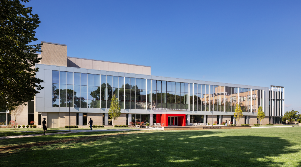 The St. Vincent Health Sciences Center at St. John’s University in Queens, New York, seamlessly blends into the academic heart of the campus. Envisioned by architects at CannonDesign, the educational facility’s dynamic and captivating architectural features draw people in with its sculptural elegance.