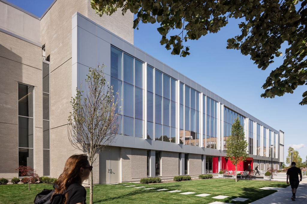The Health Sciences Center is constructed using sustainable building materials and energy-efficient systems, including our Clearwall® SSI Curtain Wall System, 1600UT System™1 Curtain Wall, Trifab® VersaGlaze® 451T Framing System and our 350T Insulpour® Thermal Entrances, and is expected to earn LEED Silver® certification. Kawneer’s thermal facade solutions were specified for the project to help minimize thermal loss while enhancing the building’s insulation and reducing energy consumption. The windows also feature bird-safe glass to protect local wildlife. Further, the educational facility is equipped with automatic doors to ensure accessibility and ease of movement for all users. These various features all contribute to the building’s modern, sustainable and occupant-friendly design.