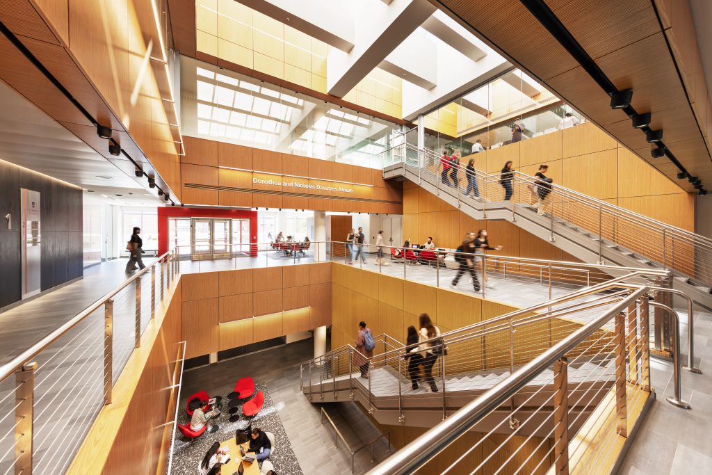 At the core of the building’s design is a multistory common space that serves as an academic hub, fostering interaction between students and faculty. The sunlit “living room” features flexible seating and open sightlines to the surrounding floors, promoting connectivity and community. The facility also features advanced simulation laboratories along with flexible learning spaces, ensuring adaptability to evolving educational needs.
